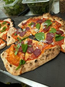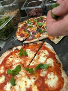 Vår favoritpizza är den med rosmarin, färskost och potatis men det blir även trygghetspizza som Margarita och pizza med rökt dovhjort. Nyskördad basilika och rucola från växthusen förstå.